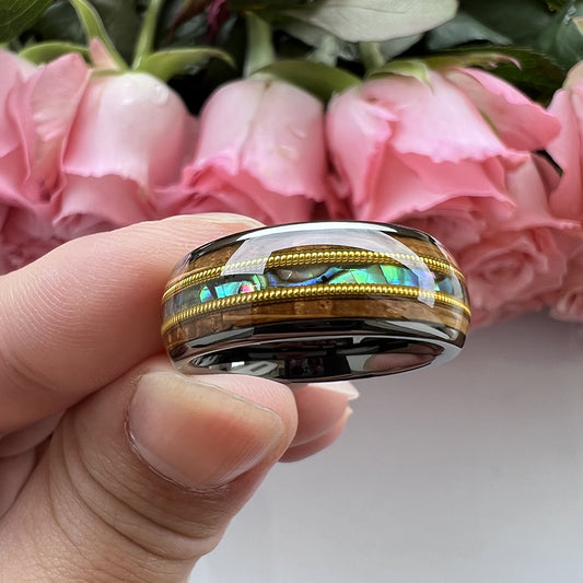 Nautical Voyage Ring - 8mm Black Tungsten Men's Ring with Rosewood Inlay & Shell – Unique Wedding Band