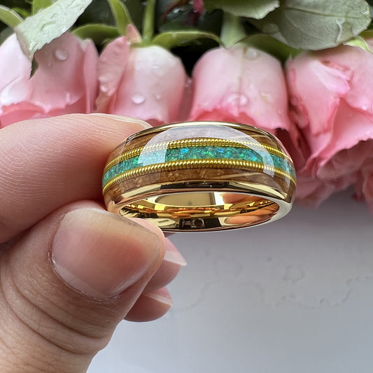 Musical Soul Ring - 8mm Tungsten Gold-Plated Men's Ring with Guitar Wood Inlay, Dual Guitar Strings & 3A Green Opal