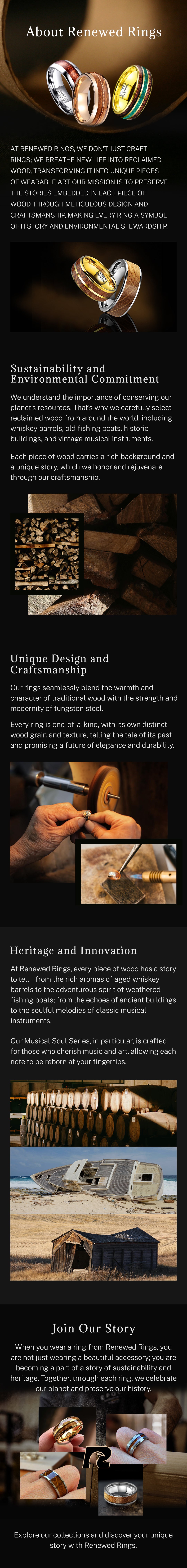A Legacy Reborn: Every piece of wood in our rings has a story. The reclaimed wood, once part of majestic historic buildings, has been transformed into cherished symbols of love and commitment. This ring is not just a piece of jewelry; it’s a piece of history, reborn to celebrate your unique journey.